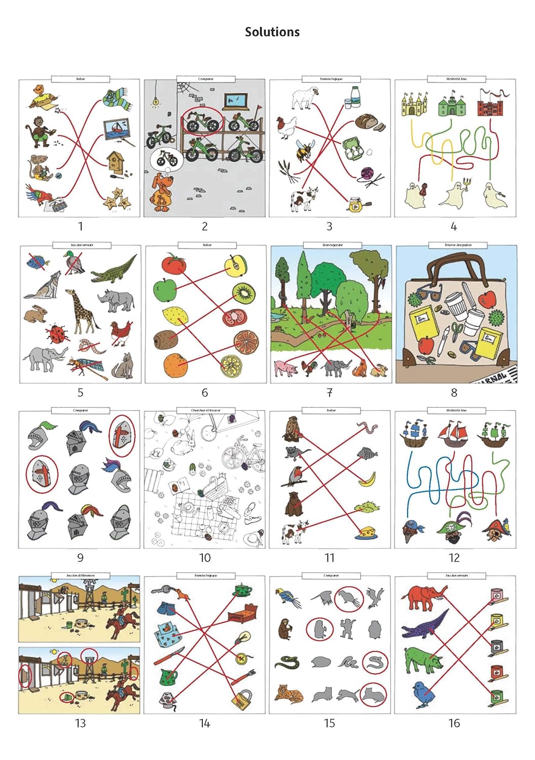 Grâce à des activités variées telles que relier des éléments correspondants, comparer des images, identifier les différences ou trouver des erreurs, l’enfant apprend à observer attentivement, à analyser et à faire des liens logiques. Ces exercices favorisent le développement de la logique, du raisonnement visuel et de la perception des détails, tout en renforçant la patience et la persévérance.